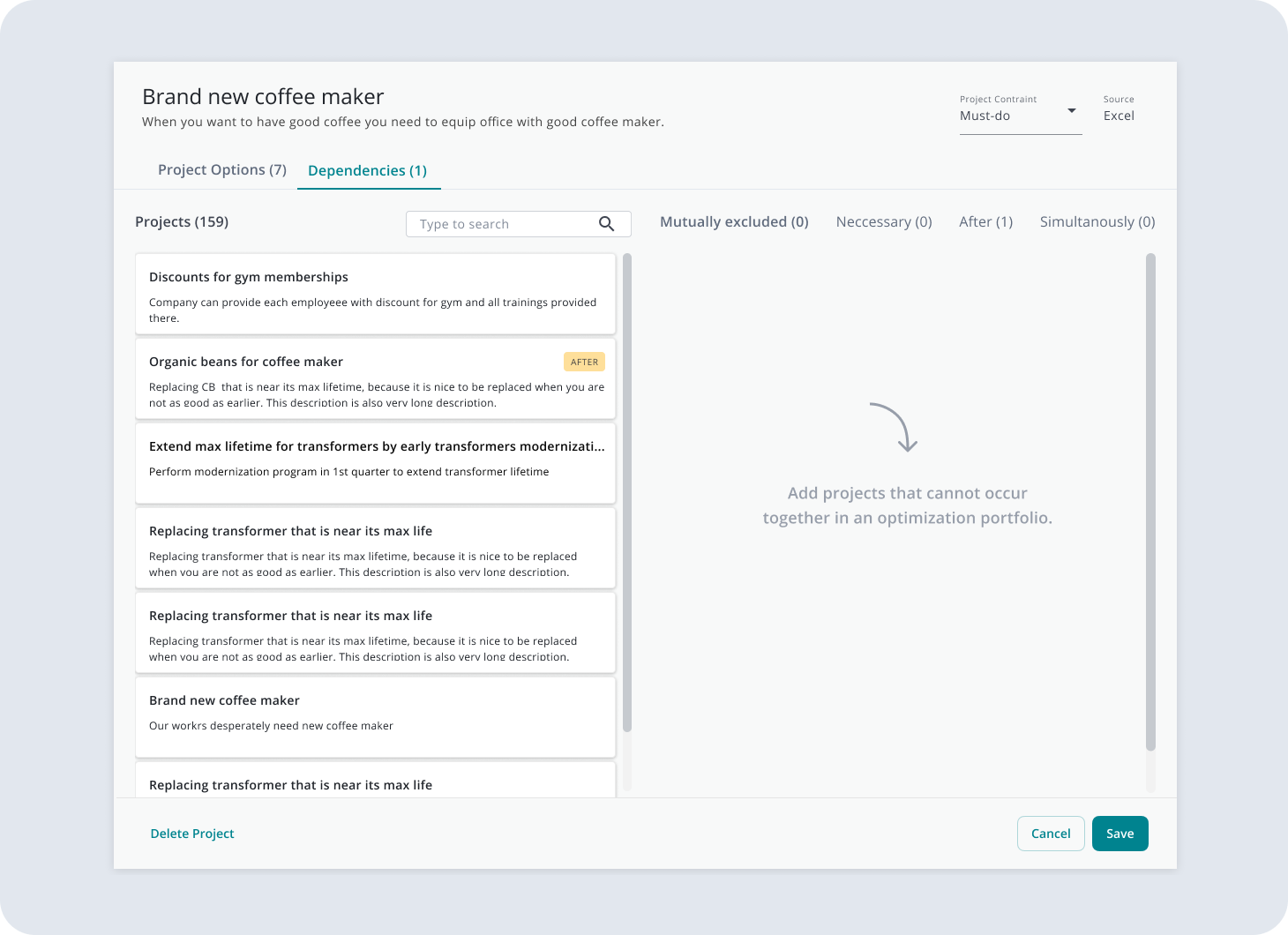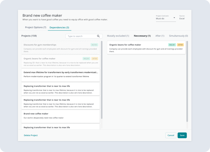 The Project tab uses a split-screen layout: on the left, the project catalog (organised by categories or folders, with search and filters); on the right, project details with options and dependencies. Users can add or remove optimisation projects and save changes without leaving the screen.