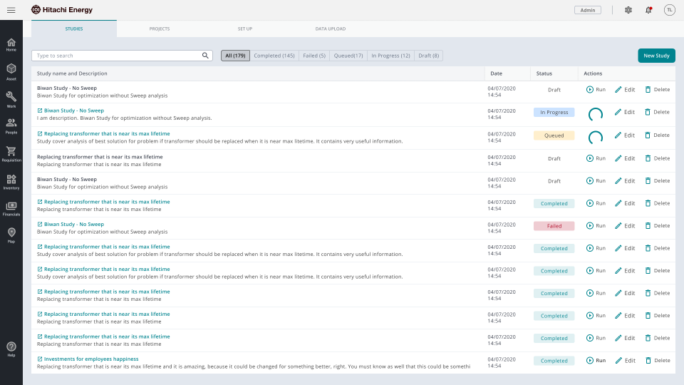 The Studies tab is a categorised search catalog so users can find studies by keywords or status. Actions like edit, delete, and run are available to manage studies. Status badges (completed, in progress, failed, queued) let analysts see state at a glance without opening each record.