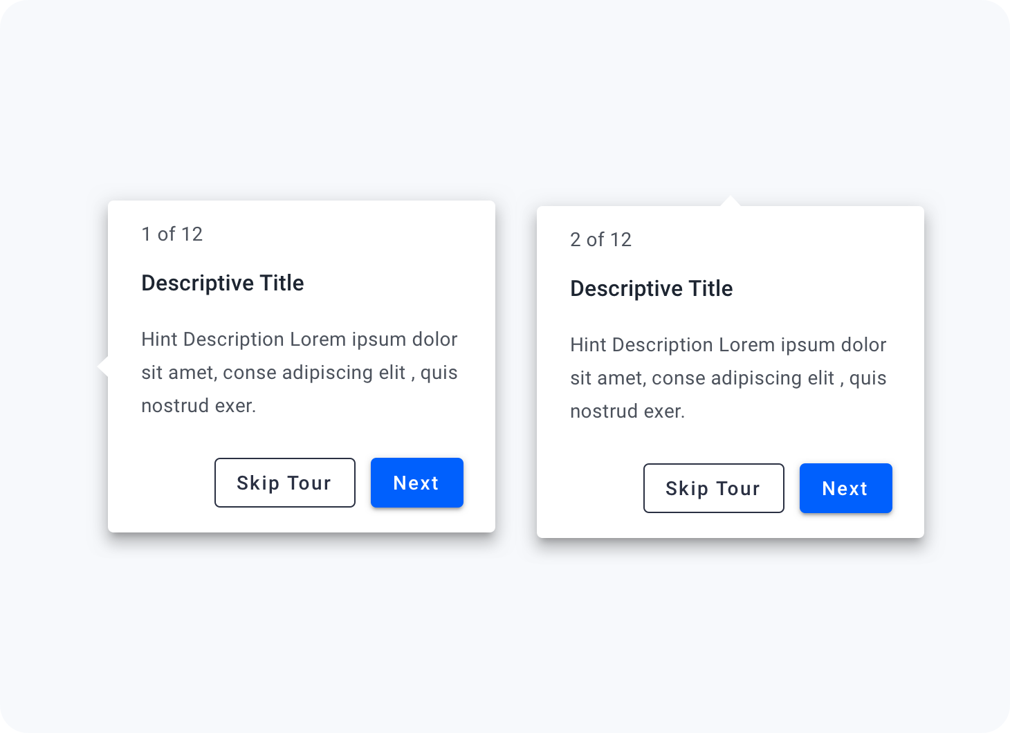 We introduced the Product Guide — a collection of user guidelines and product tours aligned to the main configuration use cases. We also added coach marks: temporary messages that educate users through new or unfamiliar flows. They can be chained so the primary action of one coach mark leads to the next. The "Skip tour" button gives users an escape path; progress display is consistent across the tour.