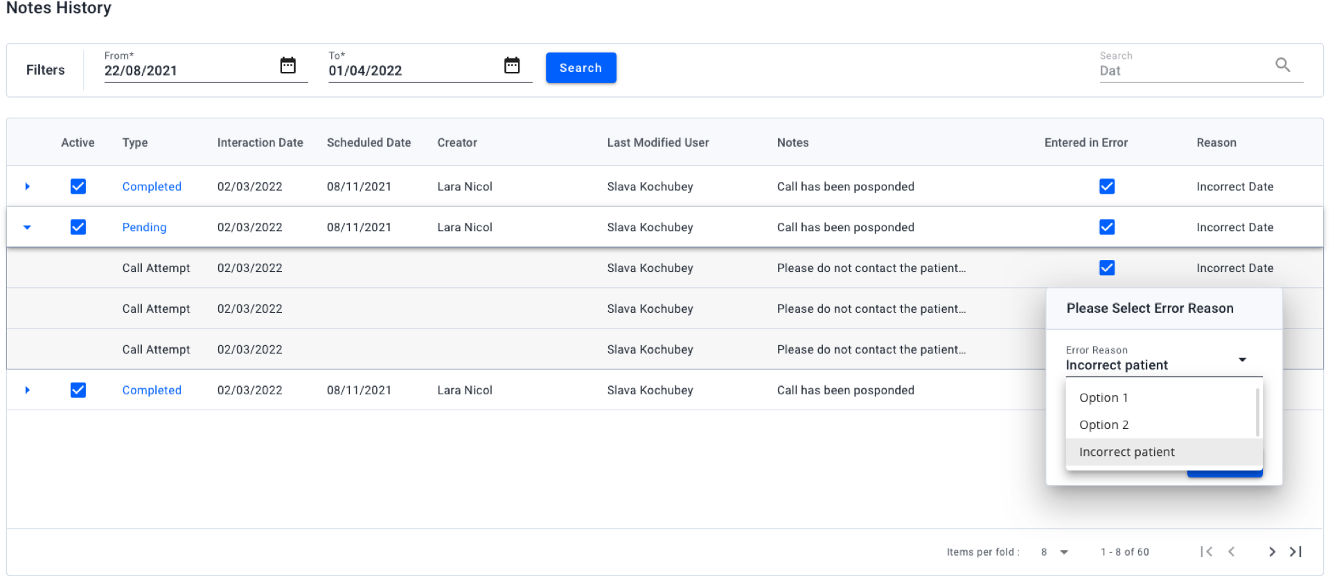 Why in-page editing for notes: We introduced expandable rows (parent/child), in-page editing via modals and popups, and filters plus search so users could find and update notes without navigating away.