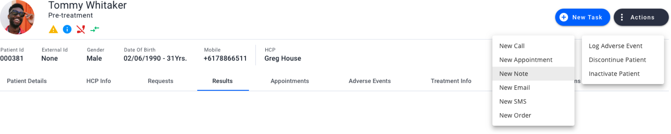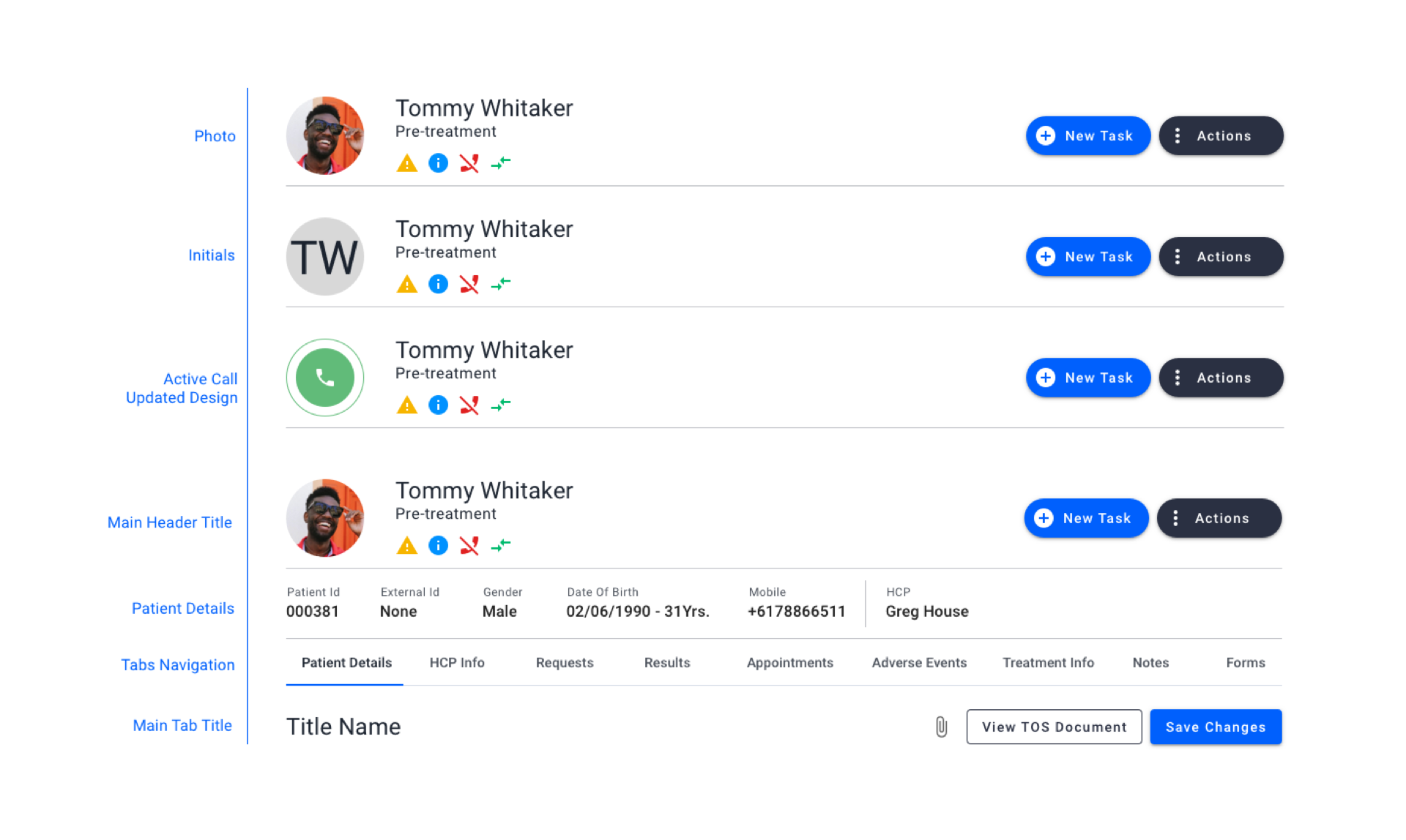 For the patient header, we combined many action buttons into two main dropdowns — New Task and Actions — and added active patient call profile indication.