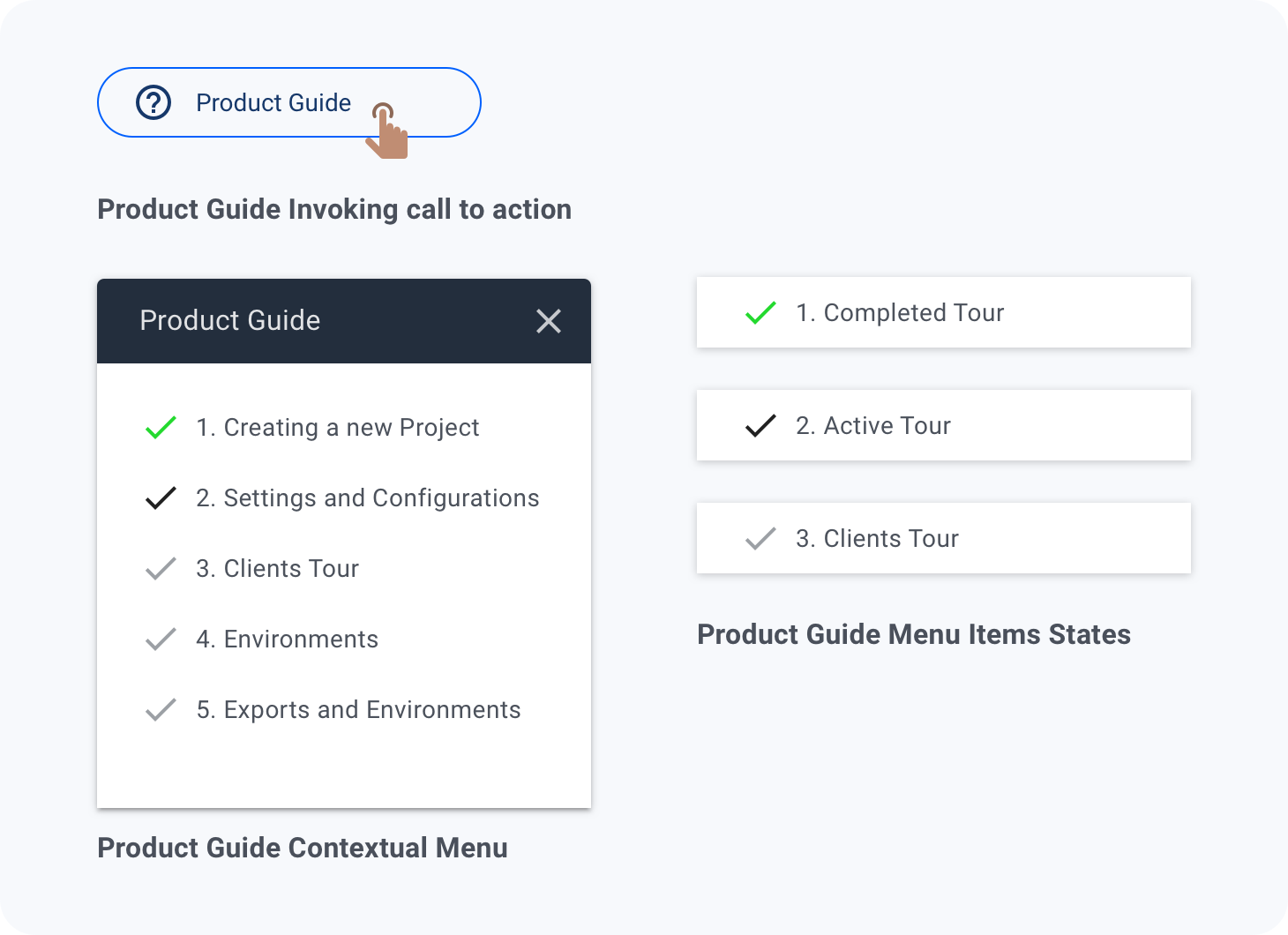 Below, the Product Guide in context (CTA, menu, and tour states) and coach marks as step cards — how chained tours and escape paths appear in the UI.